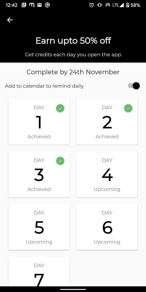 बस हर रोज ऐप में लॉग इन करें और 50% तक कैशबैक जीतें।