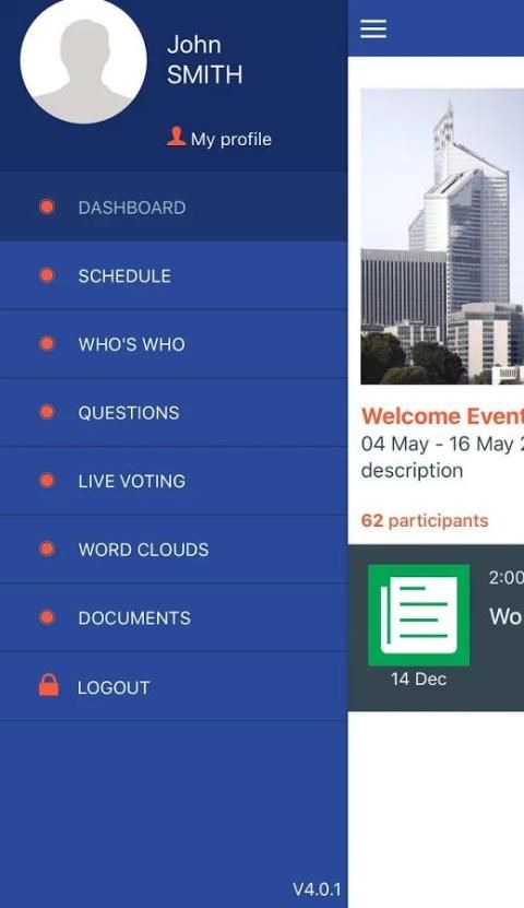 सेवा घटना के एजेंडे के बारे में विवरण प्रदान करता है, प्रतिभागियों और जानकारी को लाइव गतिविधियों (क्यू एंड ए सत्र, वोट, ...) साथ interract करने देता है।