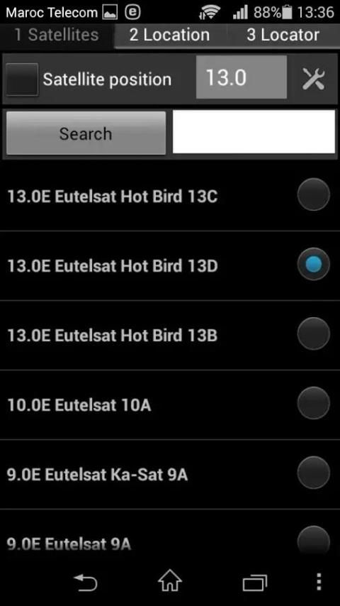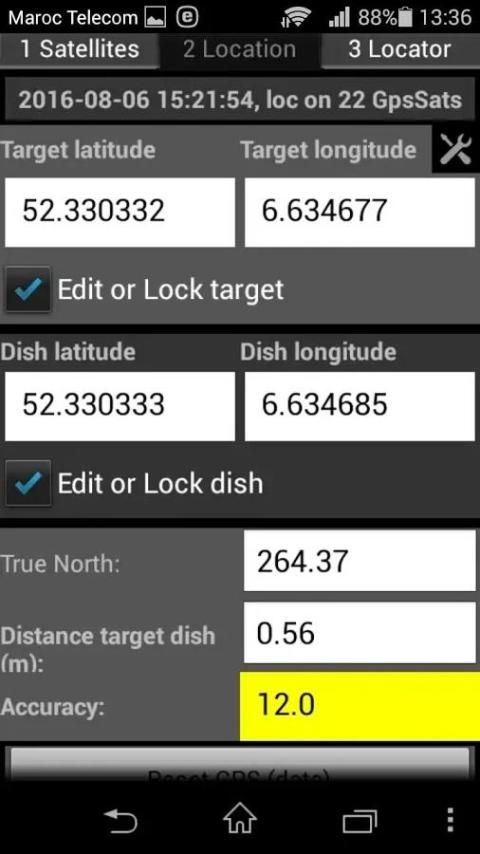 बस अपने फोन में जीपीएस सक्षम करने या अपने जीपीएस स्थान दर्ज, वांछित या उपग्रह टीवी एंटीना स्थान का चयन करें और लक्ष्य (लगता है) टीवी उपग्रह को आसमान में अपने फोन को चिह्नित करें। जब सफेद गेंद सफेद सर्कल में है और सियान गेंद सियान मंडली में शामिल है आप सैटेलाइट मिल गया है। संरेखित, दिगंश में, फोन प्रदर्शन और उपग्रह डिश पर सियान तीर करने के लिए उपग्रह डिश की भरपाई हाथ उपग्रह के साथ दिगंश में गठबंधन है।