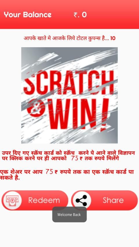 यह ऐप आपको स्क्रैच कार्ड का उपयोग करके पैसे कमाने की अनुमति देता है। आपको केवल उसी चरण का अनुसरण करने की आवश्यकता है जो एप्लिकेशन द्वारा प्रदान किया गया है।