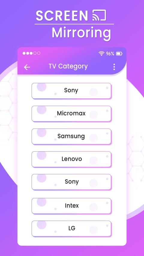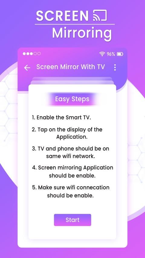 स्मार्ट टीवी ऐप के लिए स्क्रीन मिररिंग केवल सामग्री चला सकती है, लेकिन एचडीएमआई, एमएचएल, मिराकास्ट और क्रोम कास्ट जैसी स्क्रीन भेजती है। यह परीक्षण किया गया है और अधिकांश एंड्रॉइड मोबाइलों पर काम करता पाया गया है।