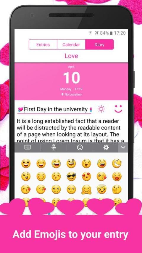 ❤ अपने कीबोर्ड के माध्यम से अपने डायरी प्रविष्टियों को Emojis जोड़ें (Android 4.1 या उच्चतर की आवश्यकता)