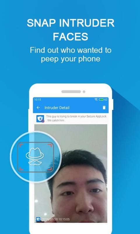 सुरक्षा AppLock इस जिज्ञासु आदमी के चेहरे की सेल्फी ले और AppLock में बचत होगी।