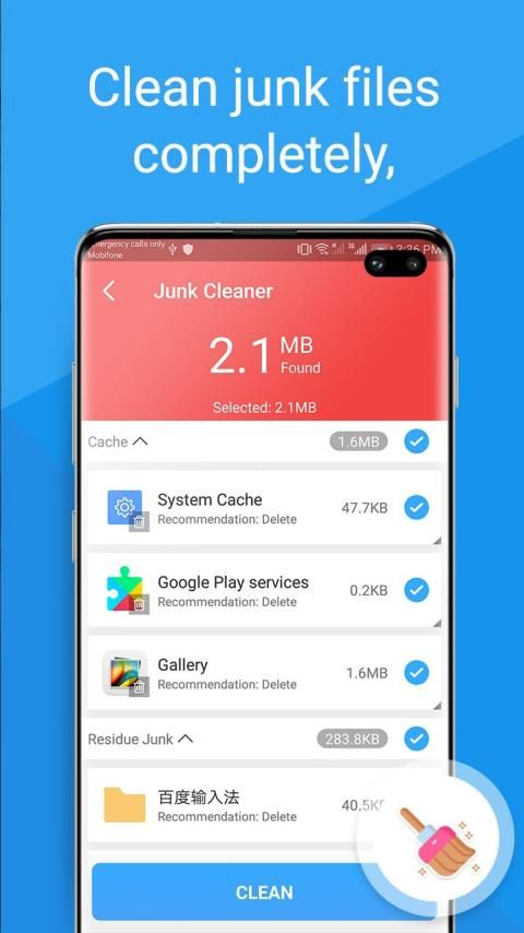 Booster speed your phone to fast more and Clean cache and clean history data. By click junk cleaner to show detail and clean internal cache and exernal cache.