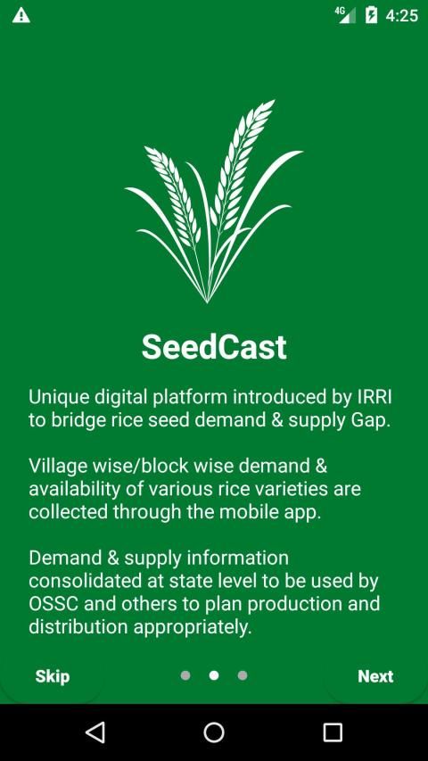 बीज की मांग और प्रमुख किस्मों की आपूर्ति के बीच भिन्नता को कम करके ओडिशा की वर्तमान चावल बीज प्रणाली को मजबूत करने के लिए, ओडिशा सरकार के समर्थन के साथ आईआरआरआई ने एक डिजिटल समाधान तैयार किया जहां चावल की किस्मों की मांग सही ढंग से जमा होती है और उसी की आपूर्ति कुशलतापूर्वक निष्पादित की जा सकती है। यह प्रणाली संभावित रूप से मांग का अनुमान लगाने के मौजूदा अभ्यास को संभावित रूप से प्रतिस्थापित कर सकती है जो अक्सर सही परिदृश्य को प्रतिबिंबित नहीं करती है और जिसके कारण मांग की गई किस्मों की आपूर्ति अक्सर गुमराह होती है और अनुचित तरीके से योजना बनाई जाती है। यह कमी राज्य में चावल की किस्मों के लिए पूरी आपूर्ति श्रृंखला प्रणाली को कमजोर करती है। इस पृष्ठभूमि के खिलाफ, यह मोबाइल आधारित एप्लिकेशन इन खामियों को दूर करने और बेहतर आपूर्ति योजना के संदर्भ में बीज श्रृंखला में सभी प्रमुख अभिनेताओं को कैपेसिटिव करने की परिकल्पना करता है। चावल के बीजों की तर्कसंगत मांग और आपूर्ति के अलावा-यह ऐप उपयोगकर्ताओं को विभिन्न HYVs, प्रमुख सूचना, सिफारिश और प्रमुख HYVs के प्रबंधन प्रथाओं के साथ HYVs की उपलब्धता के बारे में जानने का अवसर प्रदान करता है। इसके अलावा, ब्लॉक और डिस्ट्रिक्ट वाइज पैटर्न और डिफरेंट वेरिएंट डिमांड का चलन ऑटो-जनरेट होता है जो ओडिशा स्टेट सीड्स कॉर्पोरेशन और एग्रीकल्चर डिपार्टमेंट के लिए एक महत्वपूर्ण डिसीजन सपोर्ट सिस्टम है जो किसानों को पर्याप्त रूप से और समयबद्ध तरीके से बीज उपलब्ध कराने के उनके प्रयासों में शामिल है। । पूरे ओडिशा में बीज डीलर आसानी से और जल्दी से अगले सीजन के लिए चावल की विभिन्न किस्मों की मांग रख सकते हैं, जो जब आवेदन के इन-बिल्ट डैशबोर्ड के माध्यम से एकत्र की जाती है, तो यह ओएसएससी को अपने डीलरों के नेटवर्क में रणनीतिक रूप से उत्पादन और वितरण की योजना बनाने में सक्षम बनाती है, इस प्रकार किसानों की संभावना 'पसंदीदा किस्म तक समय पर पहुंच बढ़ाई जाती है। अब तक, यह ऐप बीज डीलरों को विभिन्न किस्मों की मांग करने की अनुमति देता है, लेकिन भविष्य में, इसे उन्नत और इस तरह से संचालित किया जाएगा कि व्यक्तिगत किसान भी अगले सीजन के लिए अपनी मांग को रिकॉर्ड करने में सक्षम होंगे और एकत्रित मांग को एकत्र किया जाएगा। किसानों से सीधे ओ.एस.एस.सी. लॉग इन क्रेडेंशियल वाले किसान, डीलर और सरकारी अधिकारी राज्य के चावल बीज प्रणाली को बढ़ावा देने के लिए निर्देशित विभिन्न तरीकों से इस ऐप का उपयोग कर सकते हैं।