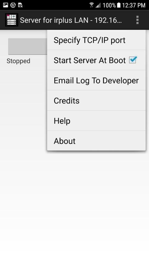 इस ऐप में मेनू सीमित विकल्प प्रदान करता है। जो मुझे महत्वपूर्ण लगता है वह है प्रत्येक डिवाइस बूट के बाद इस ऐप के सर्वर को स्वचालित रूप से चलाने के लिए चेकबॉक्स। इस तरह से यह तब तैयार होना चाहिए जब आप हों। हालाँकि, कृपया ध्यान रखें कि कुछ डिवाइस पाए गए हैं जो बूट प्रक्रिया पूरी होने पर ऐप्स को ठीक से सूचित नहीं करते हैं। मुझे पता है कि BLU Vivo XL2 एक ऐसा उपकरण है। यह डिवाइस निर्माता के निर्णयों के कारण है न कि मेरा और इसके बारे में मैं कुछ नहीं कर सकता।