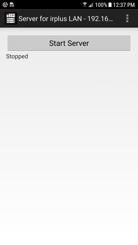 Using this app could not be easier. Just install it on your IR-equipped device, enable wifi, open the app, note the server's IP & port on the title bar (might help to see this using landscape mode), and press the Start Server button. Position your IR-equipped device somewhere with a good line of sight to the components you wish to control (I point it at my entertainment center) and you are ready to use binarymode's app on another device to send IR codes to this app for transmission.