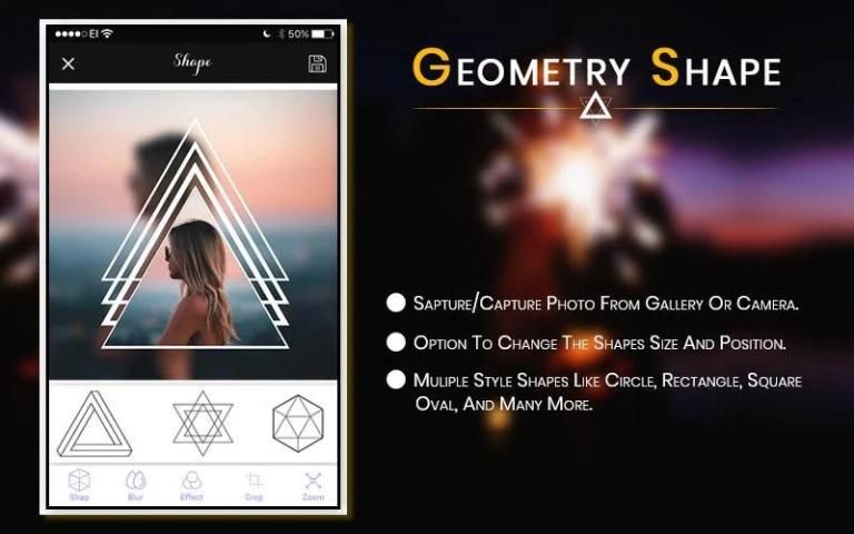 Give a creative look to every one of your pictures utilizing Overlay. Include custom typography, wonderful format covers, and exquisite stickers and Give another look to your most loved photos by applying custom shapes, examples, impacts and channels to it. Geometric Shapes Photo Editor - Geometry Camera and