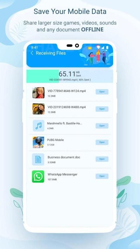 सेकंड में दोस्तों को अपनी पार्टी वीडियो भेजने की कल्पना करें! उच्चतम गति 40Mb / s तक पहुंच सकती है। दस्तावेज़ों, संगीत, चित्रों, से वीडियो और ऐप्स तक, जो कुछ भी आप चाहते हैं, उसे स्थानांतरित करें।