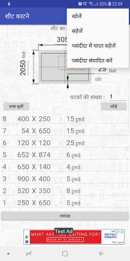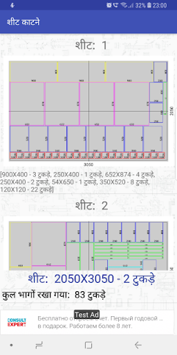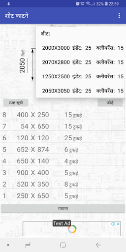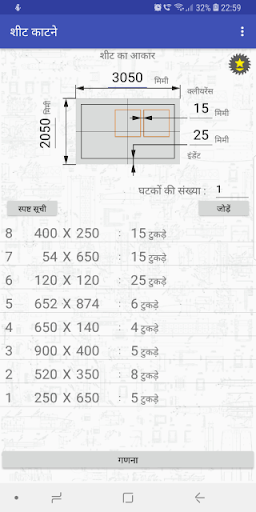 आवेदन आयताकार भागों की एक निश्चित संख्या के निर्माण के लिए आवश्यक सामग्री की चादरों की संख्या में गिना जाता है, और काटने के नक्शे से पता चलता है ।