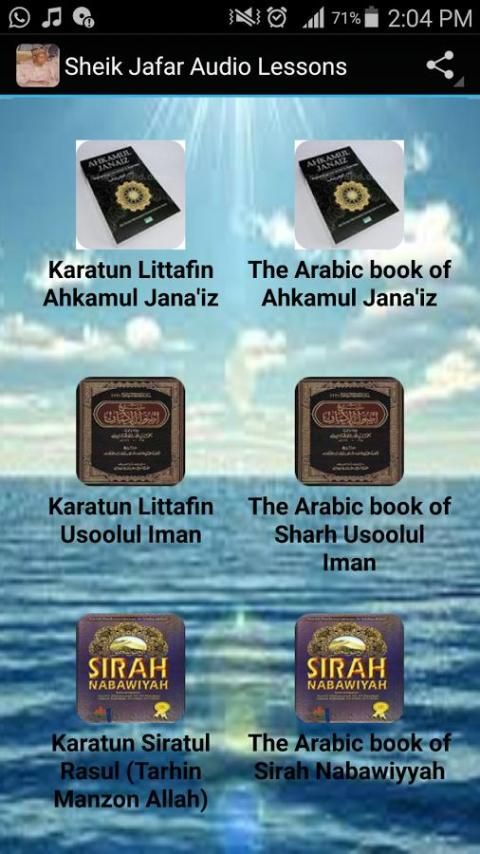 इस प्रकार के रूप में, इस आवेदन में सबक तीन पुस्तकों के होते शेख जफर महमूद एडम द्वारा दिए गए एक ऑडियो सबक है: