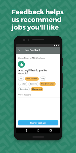 - अपनी नौकरी के बारे में प्रतिक्रिया दें ताकि ऐप आपको पसंद के प्रकार के प्रकार के आधार पर बेहतर सुझाव दे सके!