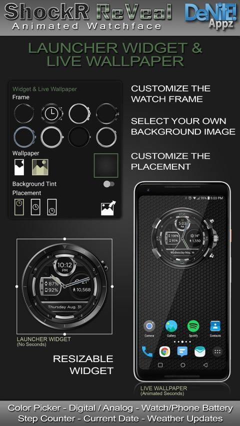 Watch Face, Clock Widget & Live Wallpaper brings a classic elegance to your wrist and Launcher. Features include custom complications, battery levels, weather conditions, step counter, color picker & date information. A settings app will also be installed on your mobile device to configure the watch face for any look you desire. Select any color and create a completely custom look for yourself! Don't have an Android Wear watch? No Problem! You can use the clock widget or Live Wallpaper on your launcher!