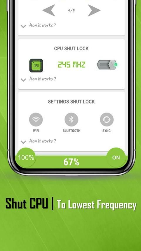 अपने सभी डिवाइस की बैटरी लाइफ को बचाने और बढ़ाने के लिए शटअप सभी बैटरी ड्रेनिंग एप्स को मारता है, सीपीयू को उसकी सबसे कम फ्रीक्वेंसी पर लॉक करता है, पावर कंज्यूम करने के लिए सेटिंग्स को हाइबरनेट करता है।