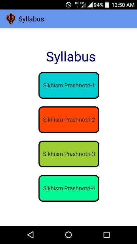This app is based on Sikh Religion. The purpose of this app is to conduct a test which is based on the age of users such as up to 5yr, 12yr, 20yr and above 20yr. The books and syllabus of the test is included in this app. Users can read the books according to syllabus and can give the test. Book-1 is for users of age 5yr, Book-2 is for 12yr, Book-3 is for 20yr and Book-4 is for users above 20yr. The test is also based on the age of the users.This app includes Gurbani, Sikhism, Syllabus, Books, Test, Rate us, Contact us, About app, Share, Feedback etc. User has to register first and after login users are allowed to give the test. Without registration users are not allowed to give the test.