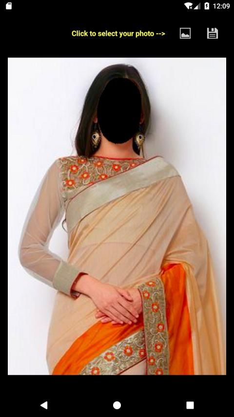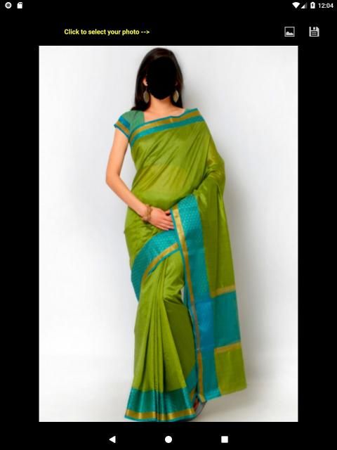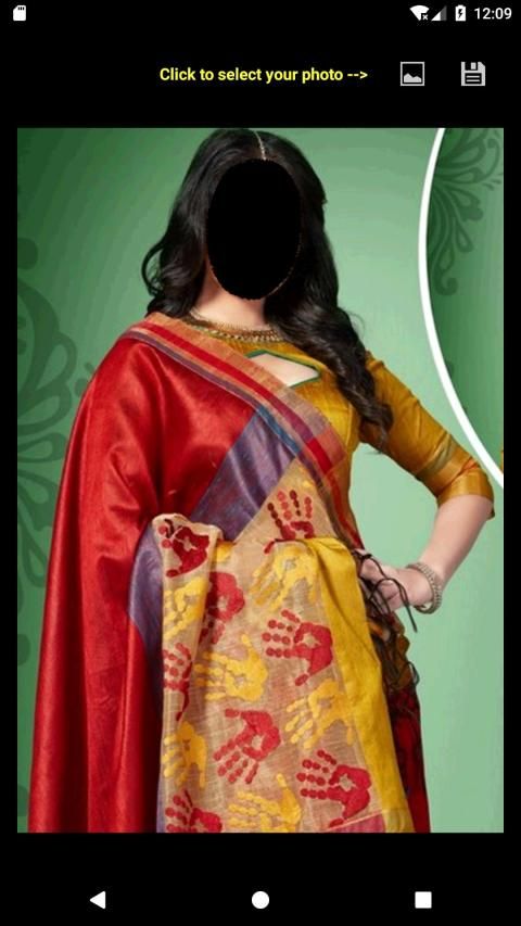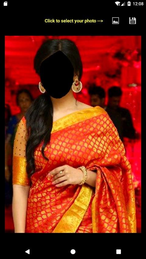 Select a Saree, select your photo from gallery, adjust your face and save. Done!