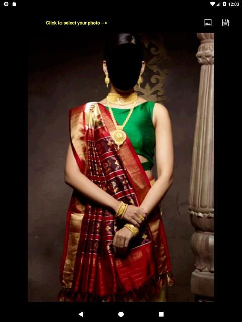 साड़ी का चयन करें, गैलरी से अपनी तस्वीर का चयन करें, अपना चेहरा समायोजित करें और सहेजें। किया हुआ!