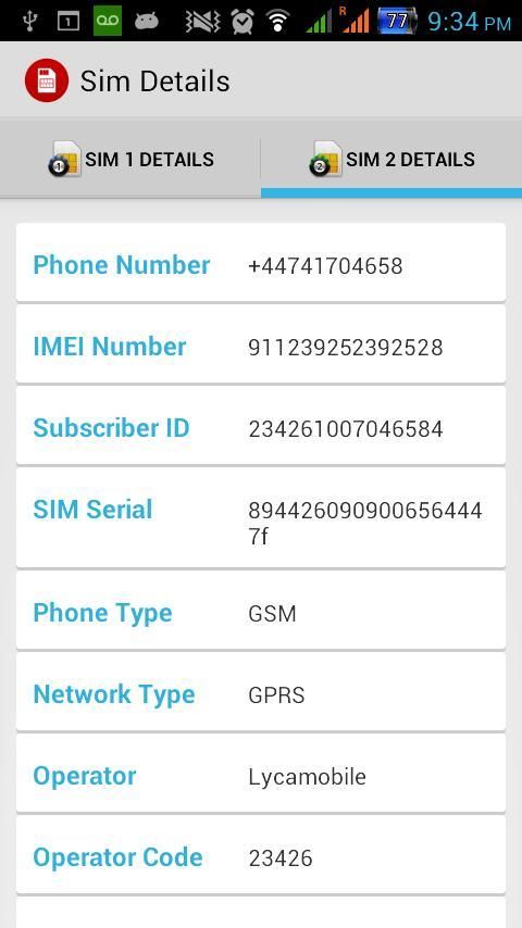 दोहरी सिम फोन में प्रत्येक सिम जानकारी अलग टैब में प्रदर्शित किया जाता है. कुछ लोगों को केवल एक सिम विवरण प्रदर्शित कर रहे हैं जिसमें सैमसंग दोहरी सिम फोन के साथ एक मुद्दा रिपोर्ट दी है. यह वर्तमान में जांच की जा रही है. आप ऐसे किसी भी मुद्दे का सामना अगर android.apps @ thinkbyte.co.uk पर एक ईमेल भेजें.