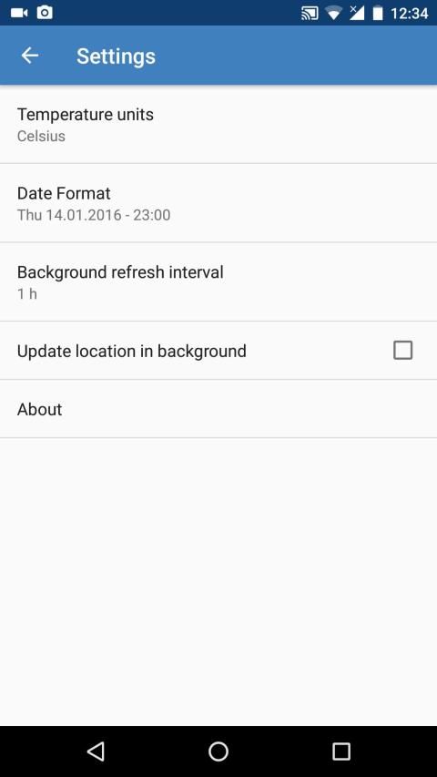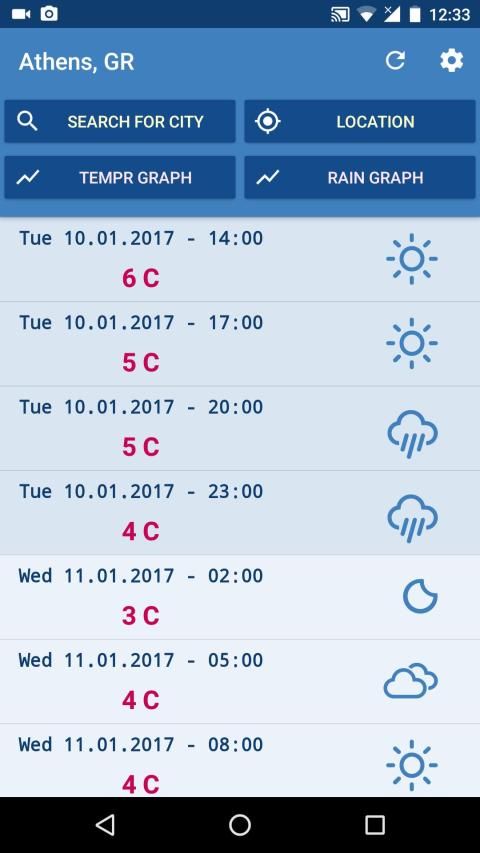 - शहर का नाम दर्ज करें या एप्लिकेशन को अपने वर्तमान स्थान मिल रहा है और मौसम के आंकड़ों के साथ प्रदान करते हैं।