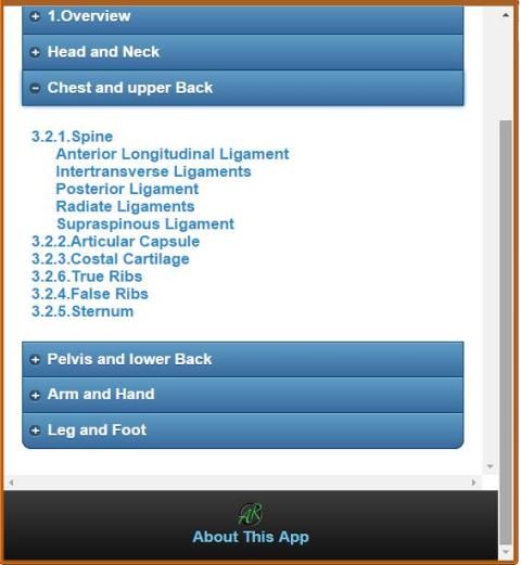 इस एप्लिकेशन में #, सभी हड्डियों और मानव शरीर के स्नायु पेश कर रहे हैं। उन भागों के पदों के चित्रों में दिखाए जाते हैं। तस्वीरें स्पष्ट और विशिष्ट हैं। तो उपयोगकर्ताओं को आसानी से बाहर बिंदु और वे सीखना चाहते हैं कि लक्ष्य हड्डियों और स्नायुबंधन समझ सकते हैं।