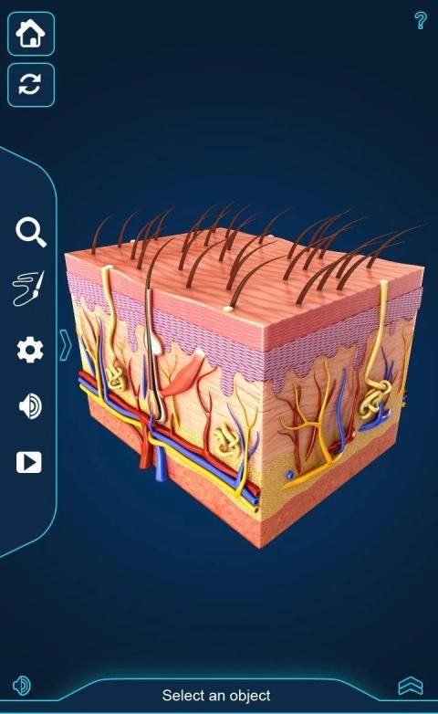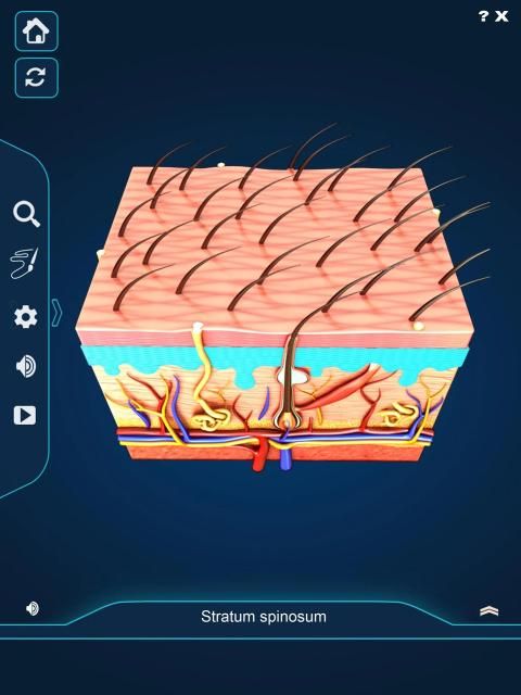 Skin Anatomy Pro. app for studying human Skin Anatomy which allows you to rotate 360° , Zoom and move camera around a highly realistic 3D model.