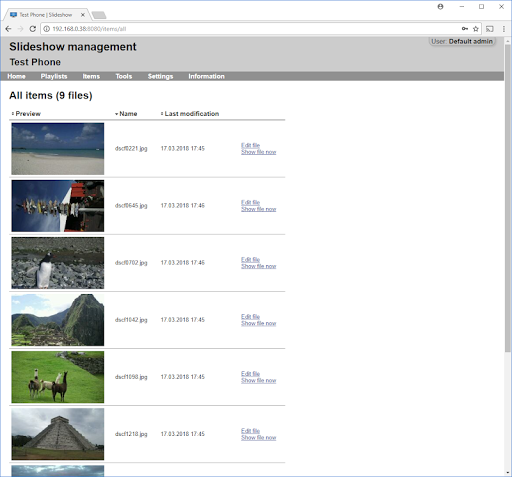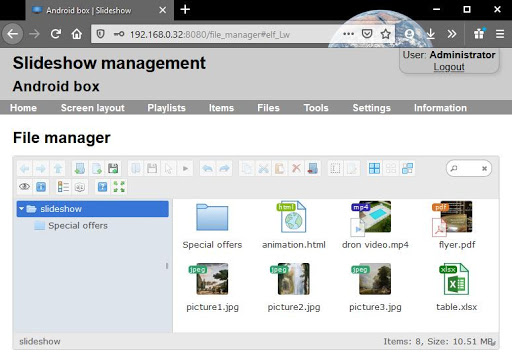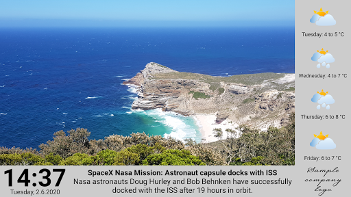 अपलोड की गई फाइलें चक्र में दिखाए गए हैं, या तो बेतरतीब ढंग से (फेरबदल पर) या वर्णानुक्रम में।वेब इंटरफ़ेस के माध्यम से, आप विभिन्न प्लेलिस्ट और स्क्रीन लेआउट सेटअप कर सकते हैं और उन्हें सप्ताह और सप्ताह के विभिन्न हिस्सों के लिए शेड्यूल कर सकते हैं।फ़ाइलें, वेबसाइट और YouTube वीडियो।आप वर्तमान तिथि के साथ ज़ोन भी जोड़ सकते हैं & amp;पूरी तरह से अनुकूलित लेआउट में समय, आरएसएस समाचार और मौसम का पूर्वानुमान।