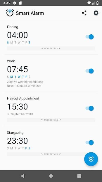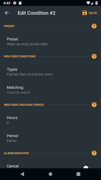 स्मार्ट अलार्म एक ऐसा एप्लिकेशन है जहां आप स्वचालित रूप से समय समायोजित करने के लिए विशिष्ट मौसम स्थितियों के साथ अलार्म सेट कर सकते हैं।