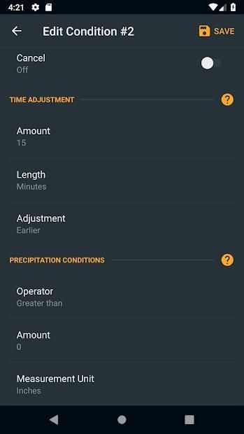 यदि अगले 6 घंटों में कम से कम 1 इंच बारिश की भविष्यवाणी हो तो स्वचालित रूप से अपने अलार्म को रद्द करें ताकि आपको उन दिनों में जागने की आवश्यकता न हो जिन्हें आप काम नहीं कर सकते।