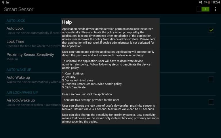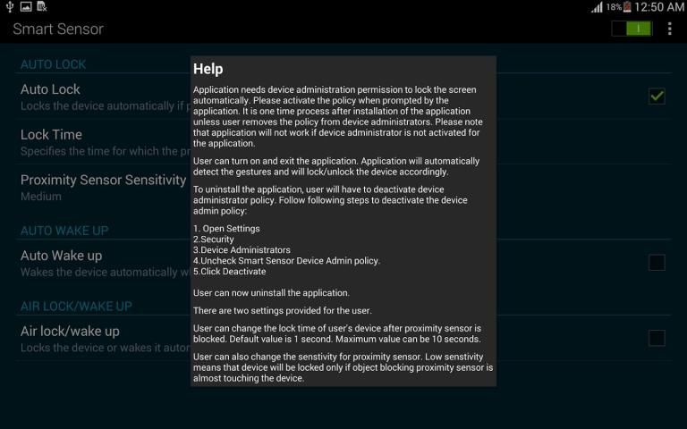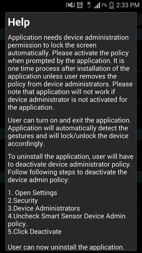 आवेदन स्वतः स्क्रीन लॉक करने के लिए डिवाइस प्रशासन की अनुमति की जरूरत है. आवेदन से संकेत दिए जाने पर नीति सक्रिय करें. उपयोगकर्ता डिवाइस प्रशासकों से नीति को हटा जब तक यह एक बार प्रक्रिया आवेदन की स्थापना के बाद है. डिवाइस प्रशासक आवेदन के लिए सक्रिय नहीं है तो उस आवेदन काम नहीं करेगा कृपया ध्यान दें.