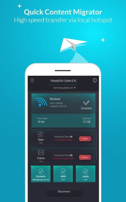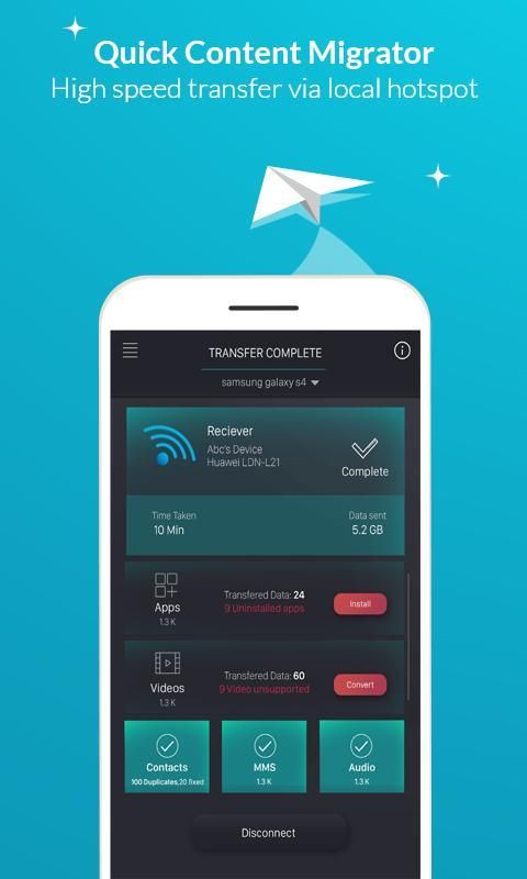 Intuitively share all your personal data to the new phone with this send big files mobile transfer app having exceptional support for android transfer & ios transfer. It quickly copies all the data & serves as best file transfer app, contact transfer app, photo sharing app, messenger migrator and video sharing app. It is efficient data management tool allowing to send large files & transfer contacts from android to iphone and all your old mobile data to new mobile without the privacy loss.