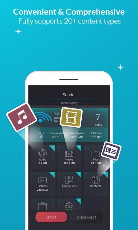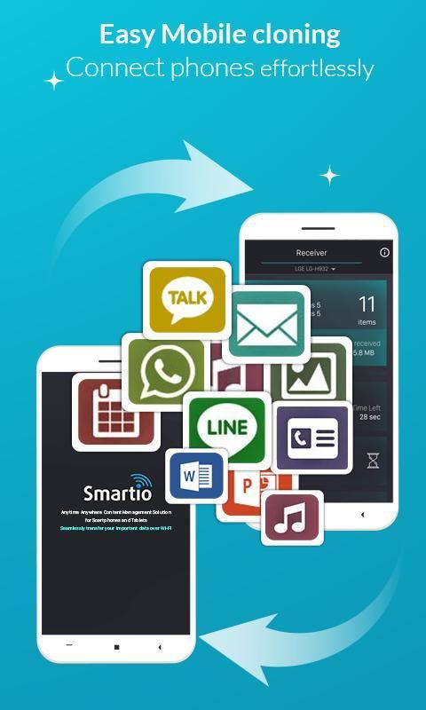 SmartIO –Transfer Content is a trusted data transfer app or mobile transfer app allowing you to send large files or share photos, videos, contacts, WhatsApp™, files and many more personal data.