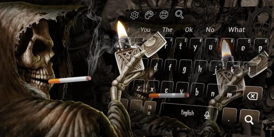 धूम्रपान खोपड़ी हल्का कीबोर्ड थीम जीवन के लिए नियमित रूप से टाइपिंग लाता है। धूम्रपान खोपड़ी हल्का कीबोर्ड / टाइपराइटर विषय एक कुंजीपटल विषय जो अंधेरे काले मौत खोपड़ी प्रकाश एक सिगरेट कुंजीपटल विषय वॉलपेपर और पारदर्शी कुंजीपटल कुंजी है।