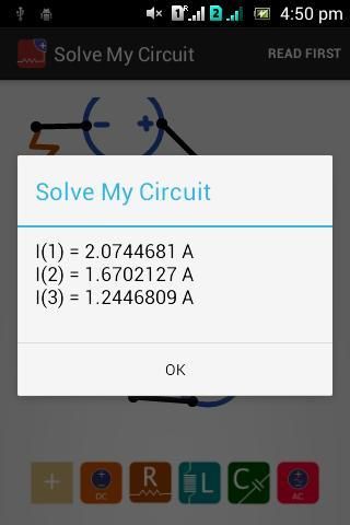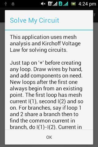 यह आवेदन सर्किट हल करने के लिए Kirchoff का वोल्टेज कानून और जाल विश्लेषण के आम अवधारणाओं का उपयोग करता है। बस सर्किट आकर्षित है, और प्रत्येक पाश के लिए, नीले डॉट्स के माध्यम से जो भी जरूरत है (आर, एल, सी, वी) में जोड़ने जब तक वे मिलने रखने के लिए और काले हो जाते हैं। कोई नीले डॉट्स मतलब सभी छोरों पूरा कर रहे हैं।