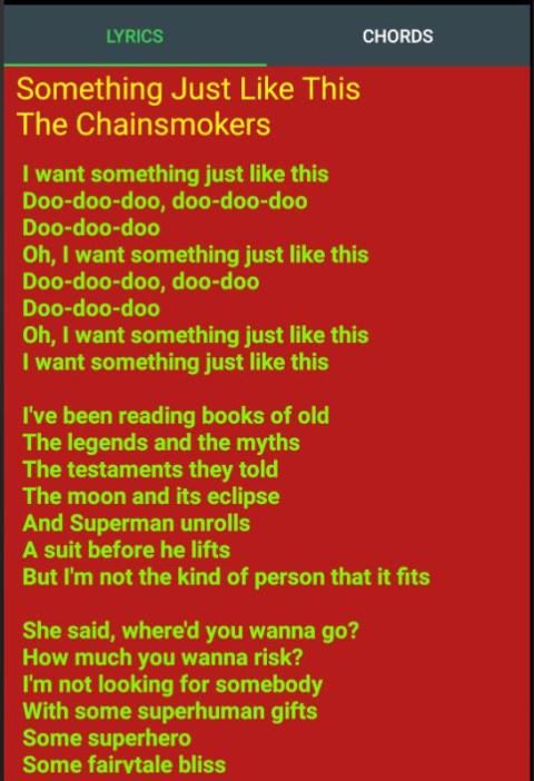 Big event coming! 20,000+ users downloaded Something Just Like This Lyrics latest version on 9Apps for free every week! Once you've used it, you'll be attracted. This hot app was released on 2017-04-19. Download and play this free app for android mobile phone now!