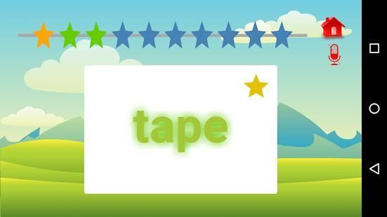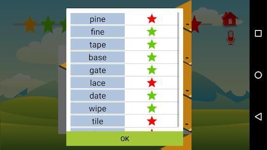 This basic and simple educational application developed in collaboration with kindergarten teachers lets your child develop an understanding of English 4 letter words. This app is a collection of four letter words that end with the vowel "e", also referred to as "magic e" words. The usage of the vowel "e" at the end of a three letter word changes the sound of the first vowel, giving altogether a new word. It enables the child to learn and test progress of four letter word recognition and pronunciation by utilizing speech recognition.