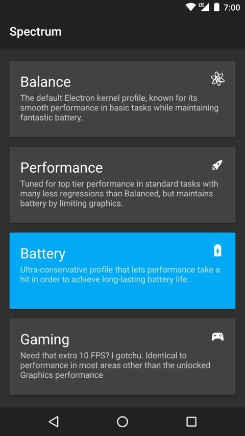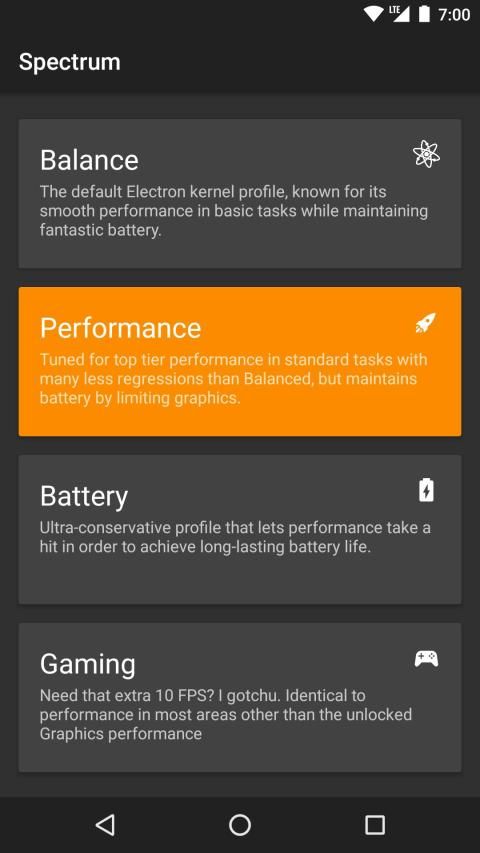 Choose from Balance, Performance, Battery, or Gaming profiles to quickly and easily change kernel settings to your preference, now even easier with the included QuickTiles.