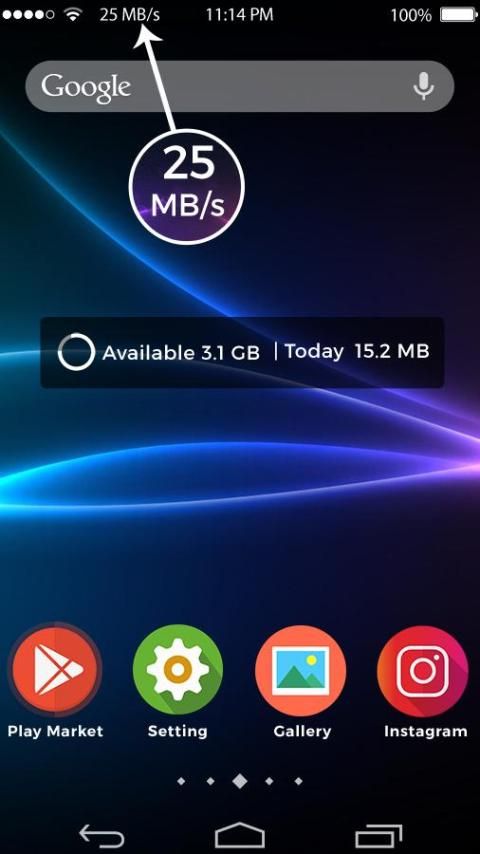 इंटरनेट स्पीड मीटर स्थिति पट्टी में अपने इंटरनेट की गति से पता चलता है और मोबाइल नेटवर्क और वाईफाई नेटवर्क का उपयोग कर अधिसूचना पैनल में इस्तेमाल किया डेटा के howmuch राशि दिखाता है।