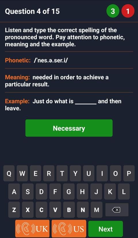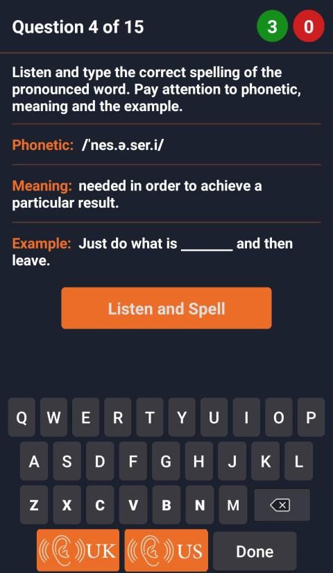 Improve your Spelling technique and learn new Vocabulary with the right British and American pronunciation, Practice your new words every time to get higher percentage on the each category that contain 15 words for each. With the phonetic description and an example and meaning for each word you will develop your language for sure.