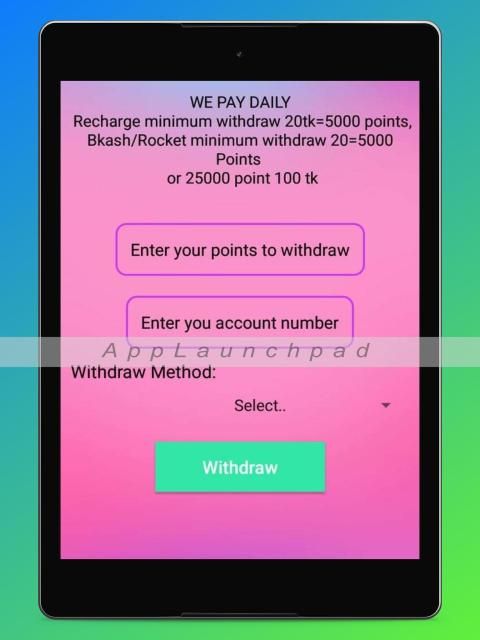 This spin earns some points by spinning through apps. You can withdraw Recharge /bkash/ Rocket that point.