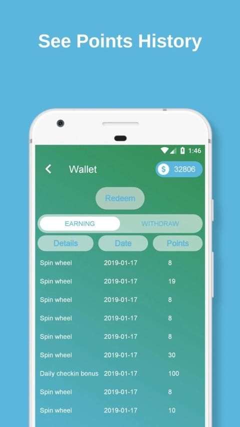 You will get daily check-ins. Daily check-ins will give you some extra points into your wallet. You can see your points history in wallet section. You can earn unlimited points with this app. There is no limit of earn points. It only depends on you, how much you are spinning. The collected points will be shown in your wallet.
