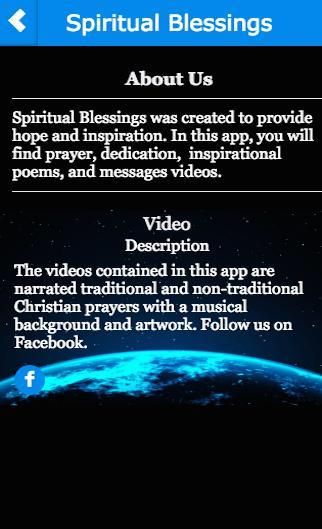 आध्यात्मिक आशीर्वाद आशा और प्रेरणा प्रदान करने के लिए बनाया गया था। इस अनुप्रयोग में, आप प्रार्थना, समर्पण, प्रेरणादायक कविताओं, और तस्वीरों के लिए कुछ नाम मिल जाएगा। एप्लिकेशन और सभी सामग्री मुफ्त है। यह आध्यात्मिकता पर मार्गदर्शन और शिक्षाओं प्रदान करने का इरादा है।