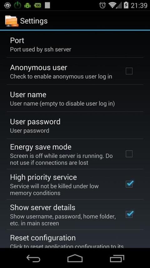 SSH सर्वर. प्रोटोकॉल एससीपी और SFTP के साथ फ़ाइल स्थानान्तरण उपलब्ध हैं. कमांड लाइन (बीटा संस्करण) भी उपलब्ध है. कमांड लाइन की जरूरत है "/ प्रणाली / बिन / श" preinstalled.