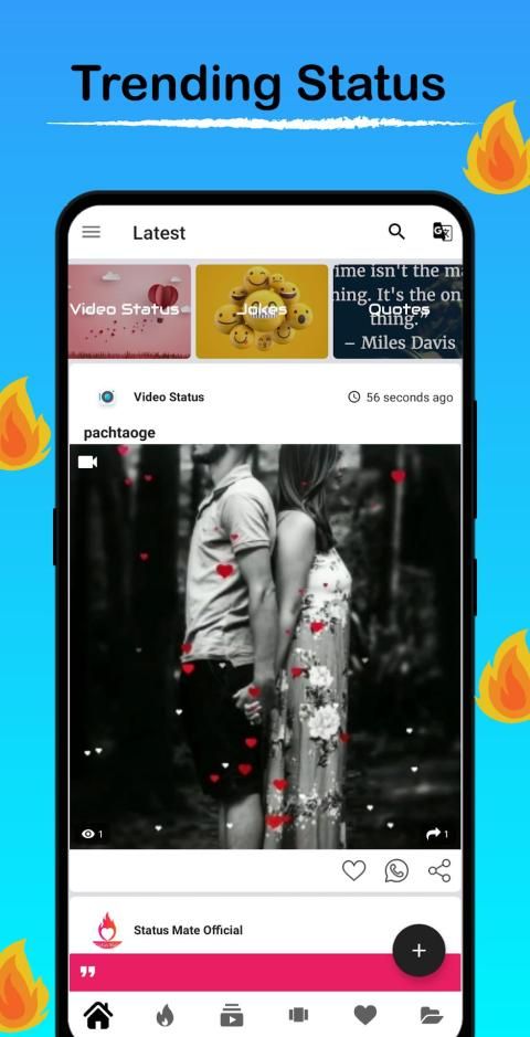 Status Mate is available in 15 regional languages. We have collected countless content such as Funny WhatsApp Status, Love Status Videos, Emotional WhatsApp Status, Motivational Videos etc. Share feelings & earn love.