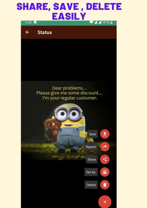 हमारी स्थिति चित्र और वीडियो डाउनलोड ऐप भी आपको आसानी से अपने खाते या अन्य सामाजिक प्लेटफार्मों पर स्थितियां साझा करने में सक्षम बनाता है। यह बहुत अच्छा है अगर आपको कोई ऐसा दर्जा मिला जिससे आप प्रेरित होते हैं और इसे अपने संपर्कों के साथ साझा करना चाहते हैं।