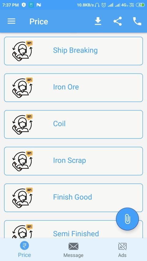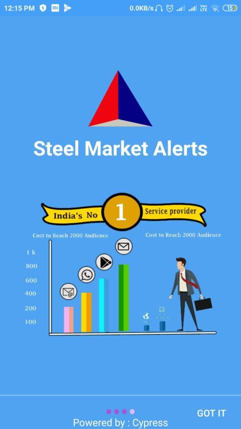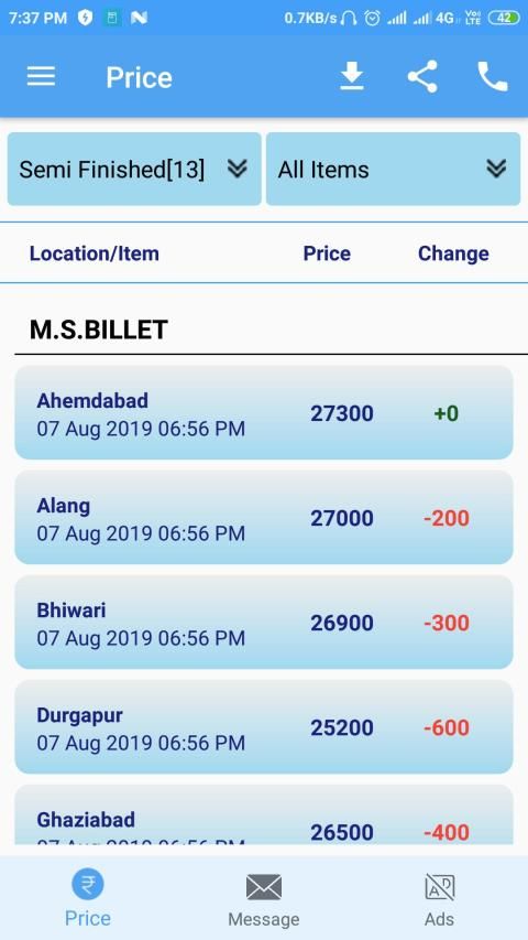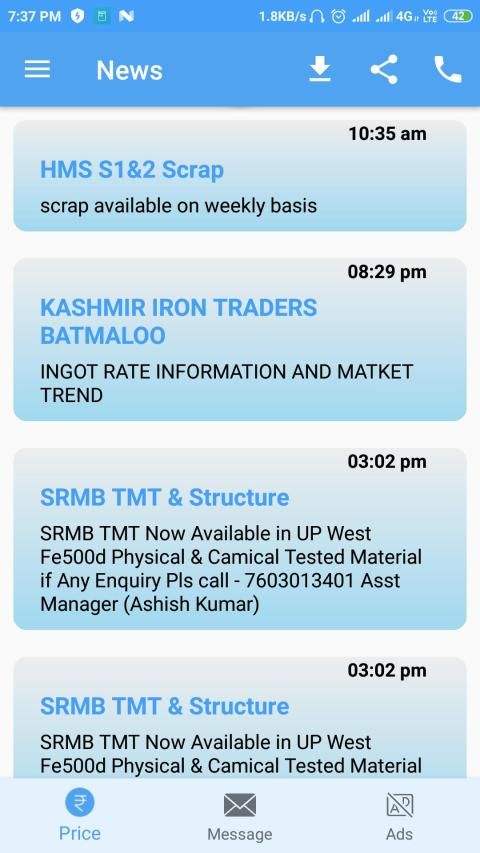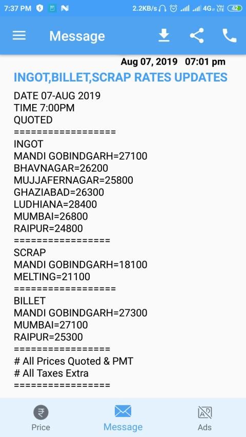 Steel Market Alerts is also providing Iron and Steel Price live on market Iron Scrap,Finished Goods, Alloys, Rolling Materials,Iron Ore,Spong Iron,Cast Iron,Commodity,Currency Rates,Gold,Sliver, Metals of cities like Mandi Gobindgarh, Raipur, Ghaziabad, Mujafar Nagar, Alang, Raigarh, Patna, Orrisa, Kalkatta, Mumbai. Indore, Pune, Hyderabad, Himanchal Pardesh, Jammu & Kashmir, Bhiwari, Durgapur, Nagpur etc. This SMS Service is provided to both Domestic and International clients. And each day company sends out 10 SMS for each Group to all the clients.