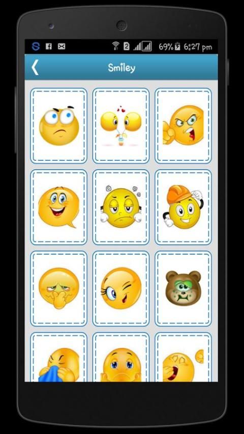 - आदि स्माइलीज, भावनाएँ, पशु, प्रेम, संदेश, कार्टून, सुप्रभात, जन्मदिन सहित 9 श्रेणियों