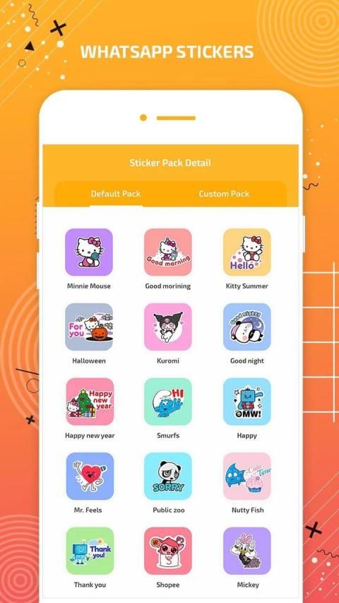 गुड मॉर्निंग, गुड नाइट, बर्थडे, न्यू इयर, सेलिब्रिटी, मेमेस, क्रिसमस, डेली कसरत, मजेदार, देसी और कई अन्य एप्लिकेशन जैसे कई डिफॉल्ट पैक भी उपलब्ध हैं।