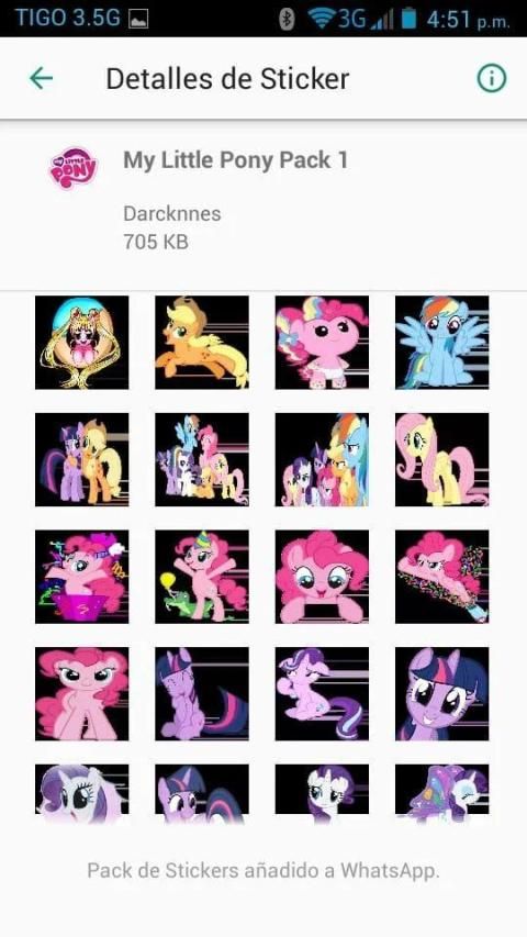 Paquete surtido de Stickers que cuenta con 2 carpetas de Sailor Moon y de My Little Pony de cada uno, puede ser instalado en cualquier dispositivo que sea compatible con la versión de Stickers de Whatsapp, puedes hacer de tus conversaciones algo entretenido y expresivo con estás imágenes sin fondo, es con mucho gusto y espero que lo disfrúten >3<.