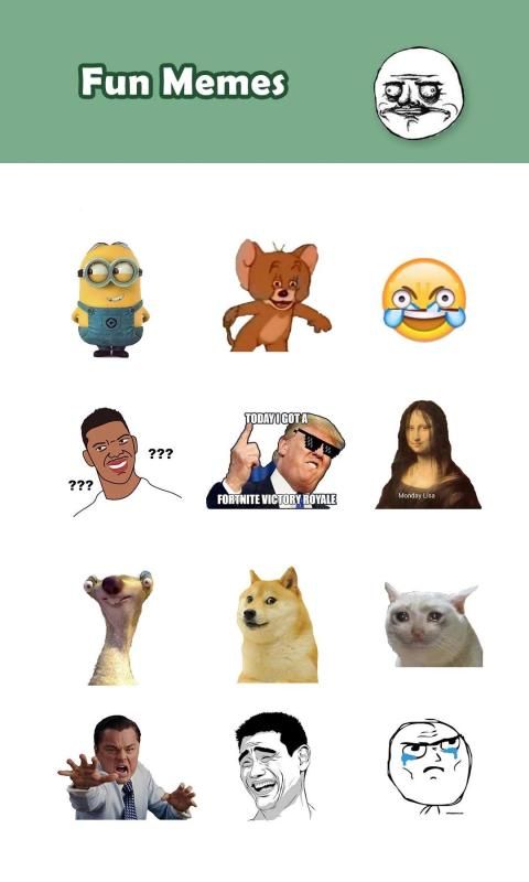 फुन मेमे इमोटिकॉन्स: निक यंग, रेज कॉमिक, याओ मिंग मेम, लियोनार्डो डिकैप्रियो मेम।