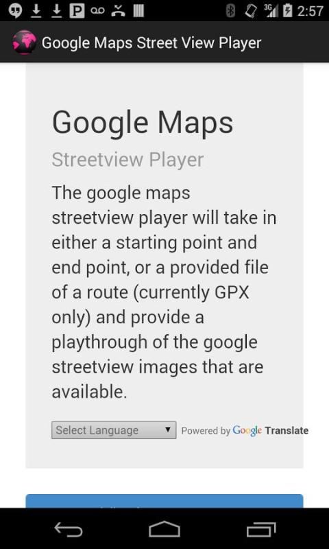 गूगल मैप्स की सड़क खिलाड़ी एक प्रारंभिक बिंदु और अंत बिंदु, या (वर्तमान में GPX केवल) एक ट्रेन के एक प्रदान की फाइल में या तो लेते हैं और उपलब्ध हैं कि गूगल Streetview छवियों का एक playthrough प्रदान करेगा.